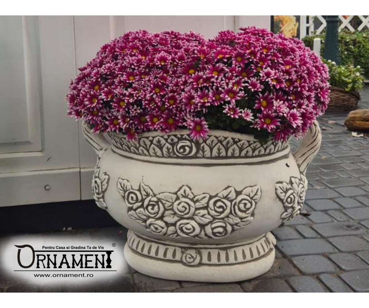 gratia. Ornamentele florale sculptate cu atentie confera ghiveciului o aura de