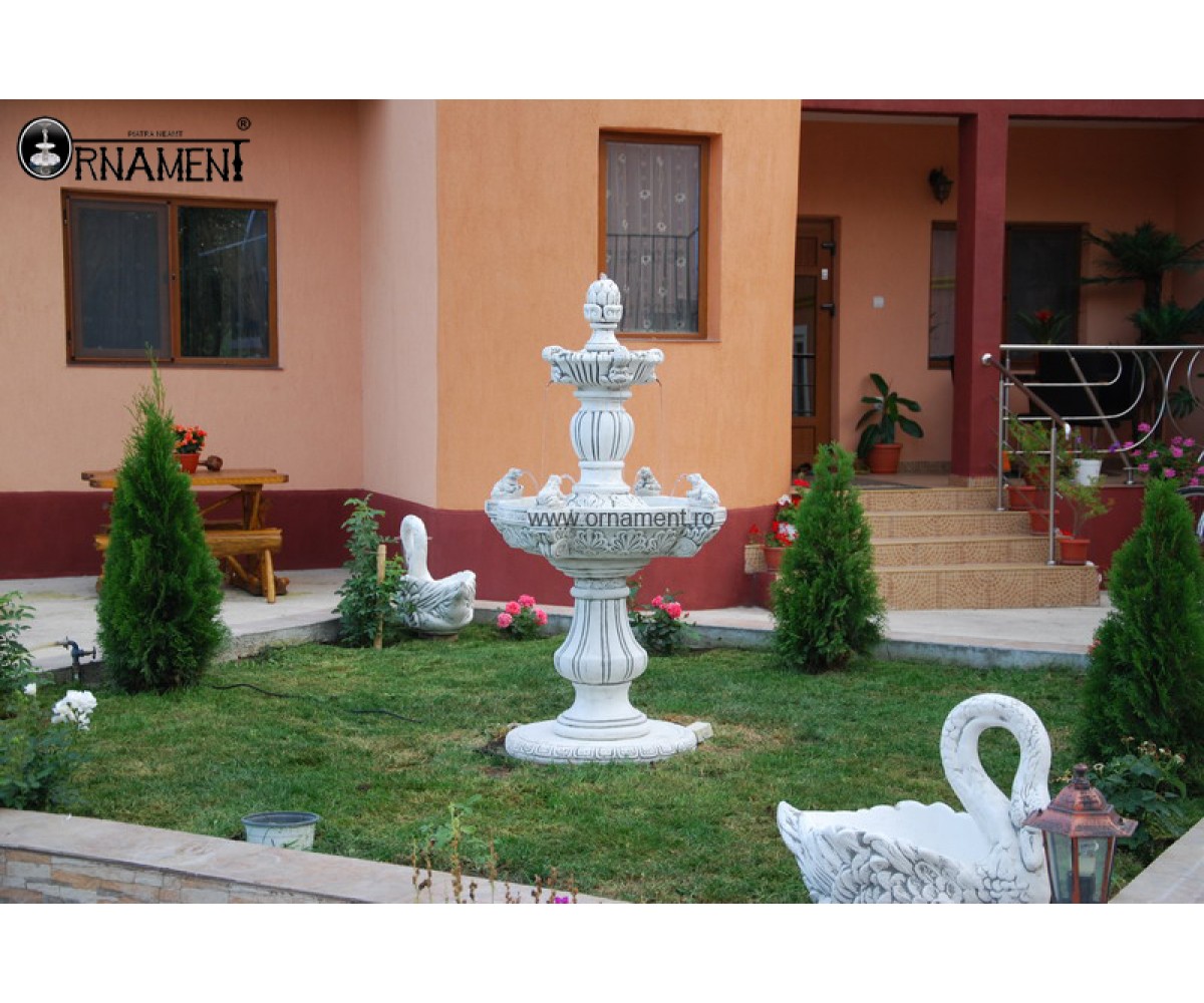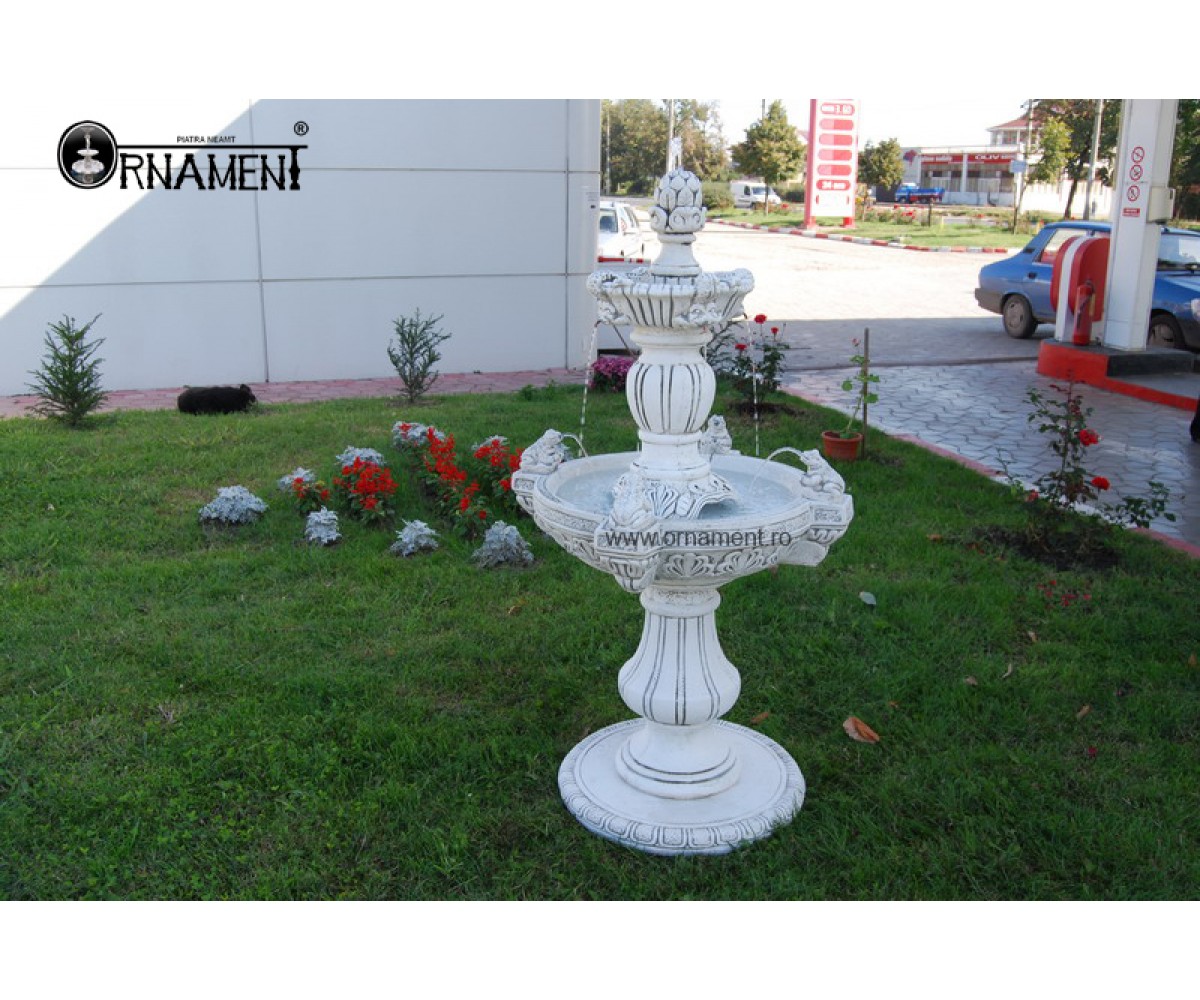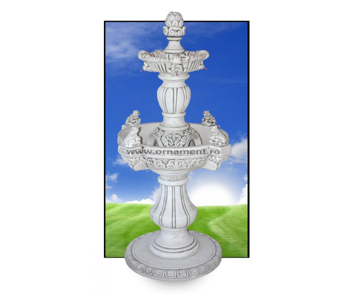 Aceasta fantana arteziana decorativa cu broscute este conceputa special pentru a functiona fara bazin. A fost gandita pentru a pune in valoare gradinile de dimensiuni medii si mici. Curgand apa prin noua locuri, ghinda din varf, gura pestilor de pe prima farfurie si a celor patru broscute amplasate simetric pe farfuria mare, aceasta va crea un impact auditiv foarte relaxand, creaind impresia de izvor curgator. Pentru a functiona este nevoie de o pompa submersibila pentru recircularea apei care se poate achizitiona separat.