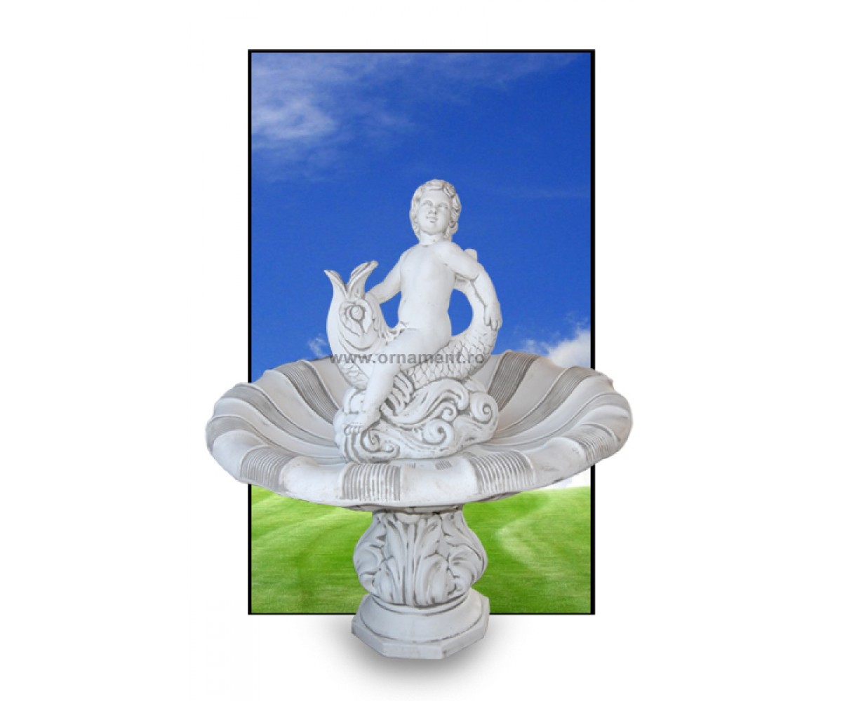 Inconjurata de plante si scaune confortabile Fantana arteziana decorativa Copil pe Peste va face centrul gradiniii dumeavoastra mult mai captivant si relaxant. Apa va curge din gura pestelui in farfuria mare a fantanii, care este asezata pe un fundament robust cu motive florale, daca se doreste ca apa sa curga si din ultimul nivel va trebui montata impreuna cu unul dintre Bazinele pentru Fantani. Pentru a functiona este nevoie de o pompa submersibila pentru recircularea apei care se poate achizitiona separat