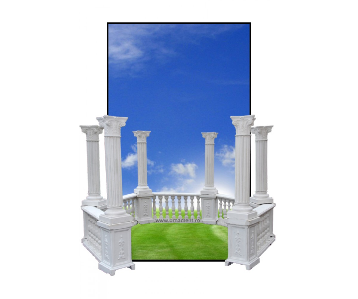 Foisor din coloane ornamentale din beton MarmoTek® cu capitel in stilul clasic Corintic si troncon cu caneluri. Racle din balustri si mana curenta. Pefecte pentru amenajari exterioare.
