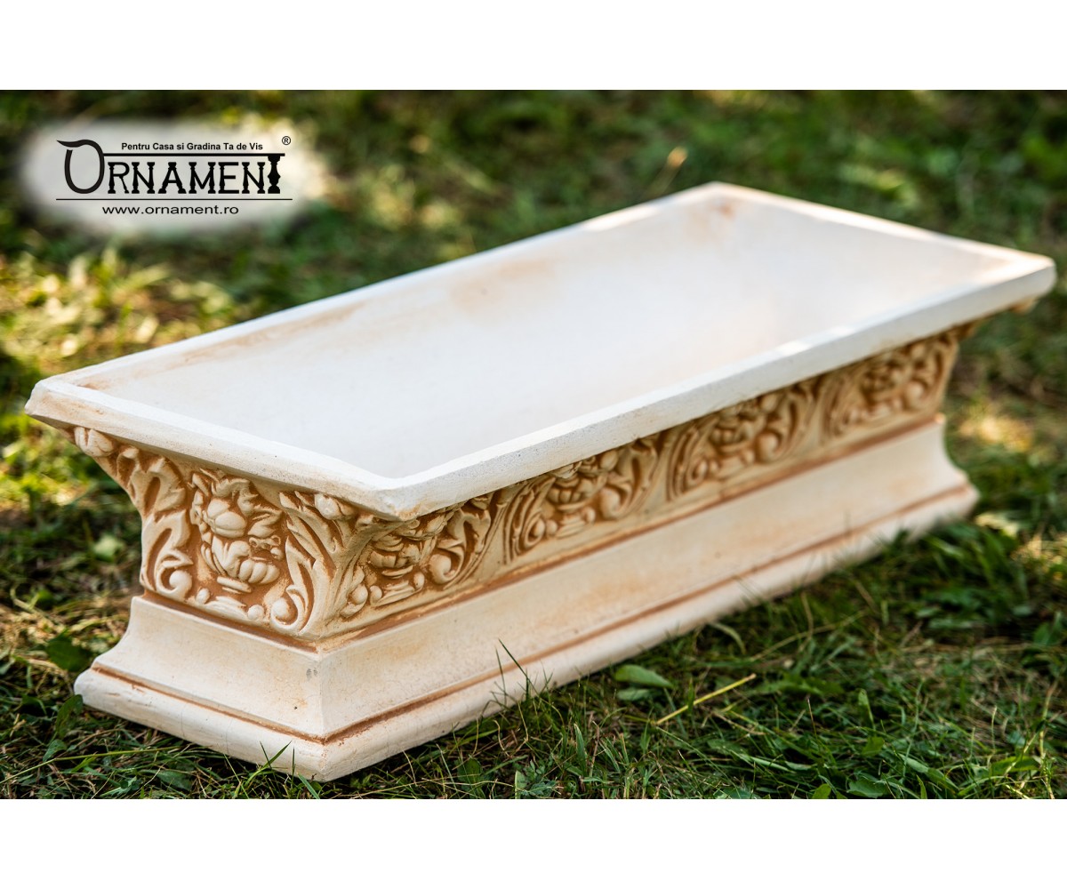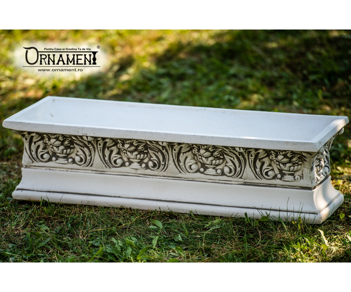 O jardiniera sculptata cu motive florale, impunatoare prin eleganta deosebita, se incadreaza perfect intr-o gradina sau terasa cu flori viu colorate.