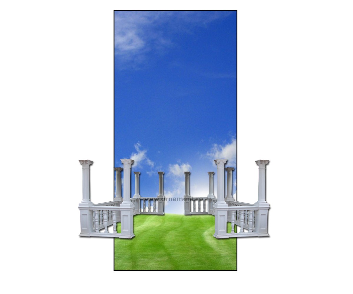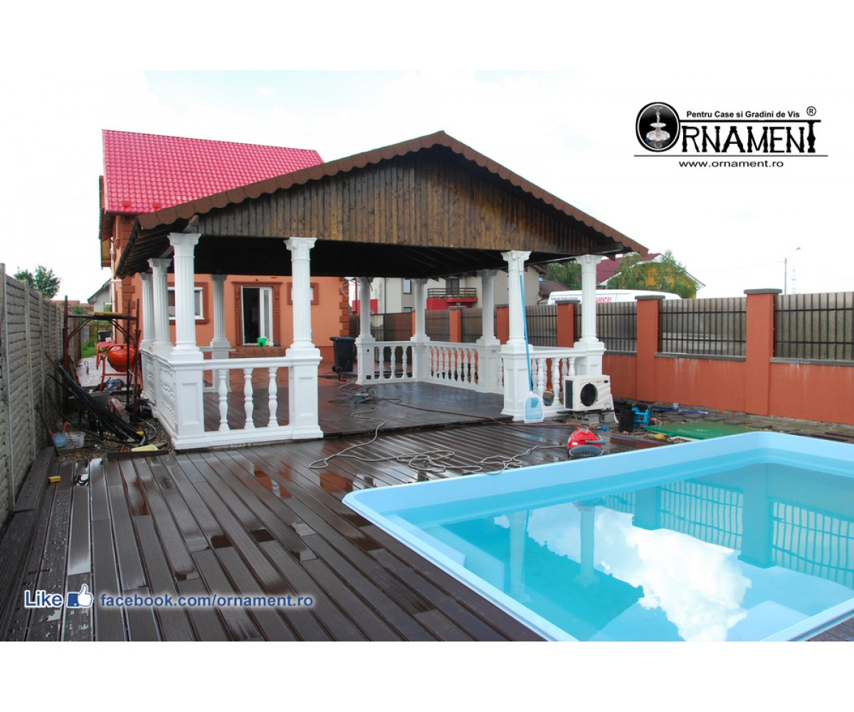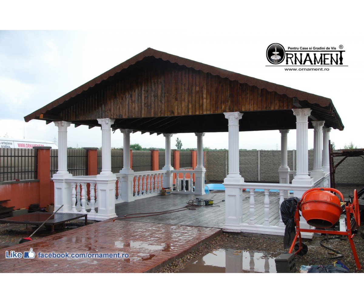 Foisor din coloane ornamentale din beton MarmoTek® cu capitel in stilul clasic Corintic si troncon cu caneluri. Racle din balustri si mana curenta. Pefecte pentru amenajari exterioare.