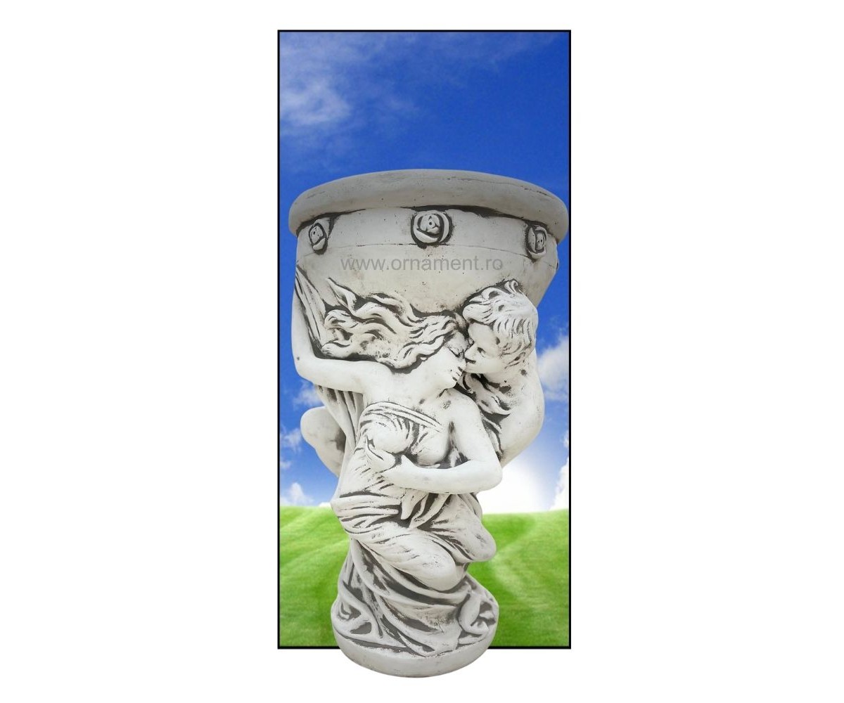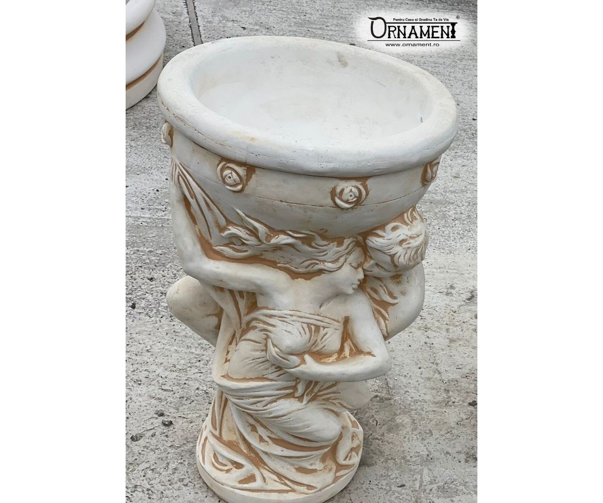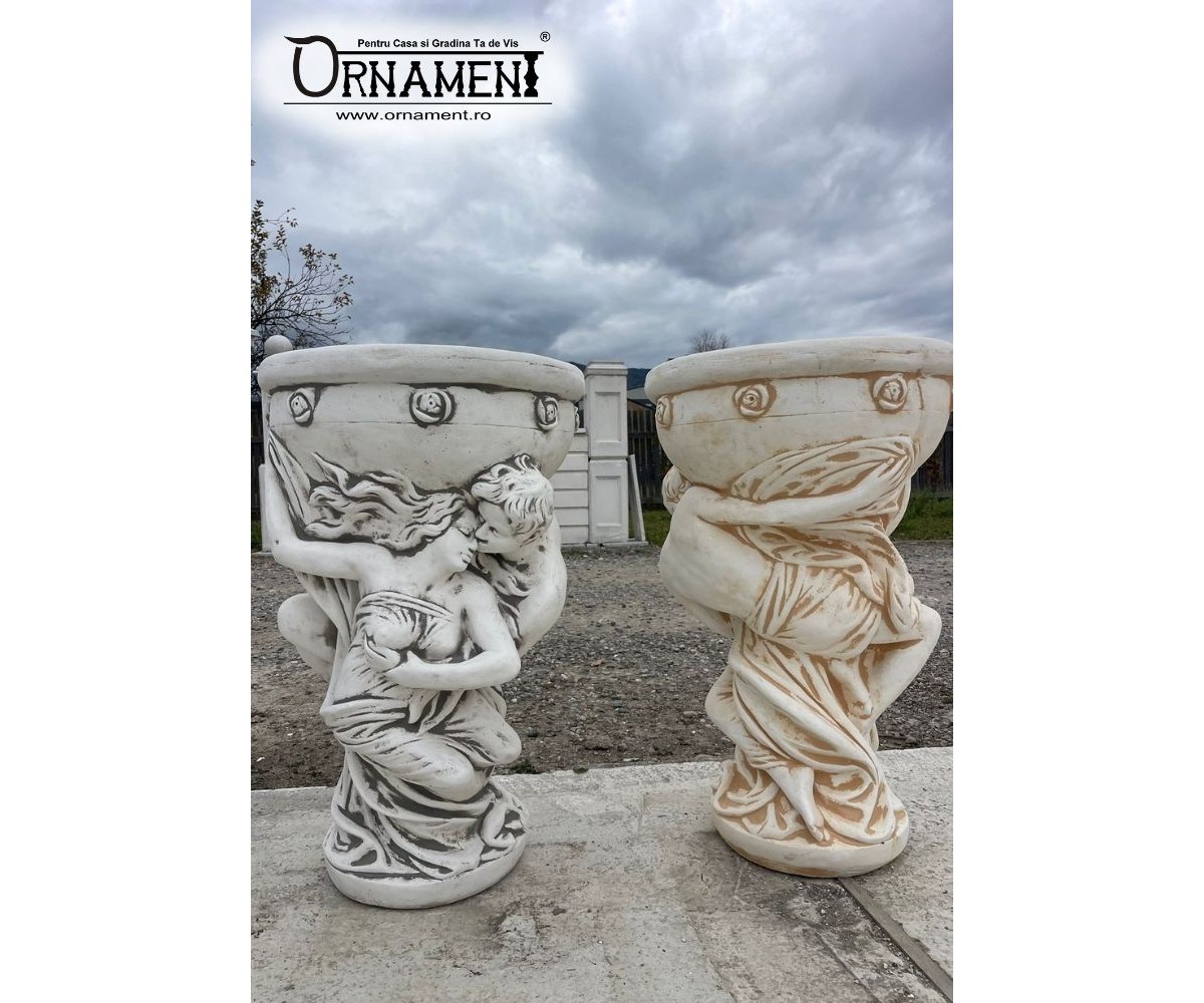 Pe langa impactul vizual, ghiveciul este sustinut de o statueta, combinand utilul cu placerea estetica. Aceasta transforma orice planta intr-un element central al decorului, facand din flori si plante parte din povestea de iubire pe care statueta o spune. Ghiveciul se integreaza perfect, adaugand profunzime si dinamism scenei, iar fiecare privire asupra lui aduce un sentiment de bucurie si armonie. Este o piesa care nu doar infrumuseteaza spatiul, ci creeaza o experienta vizuala si emotionala completa, in care natura si arta se intalnesc in mod elegant.