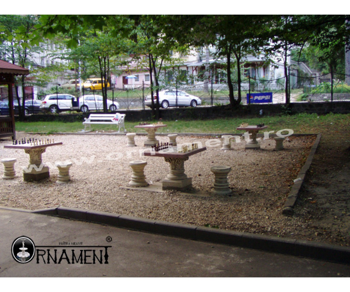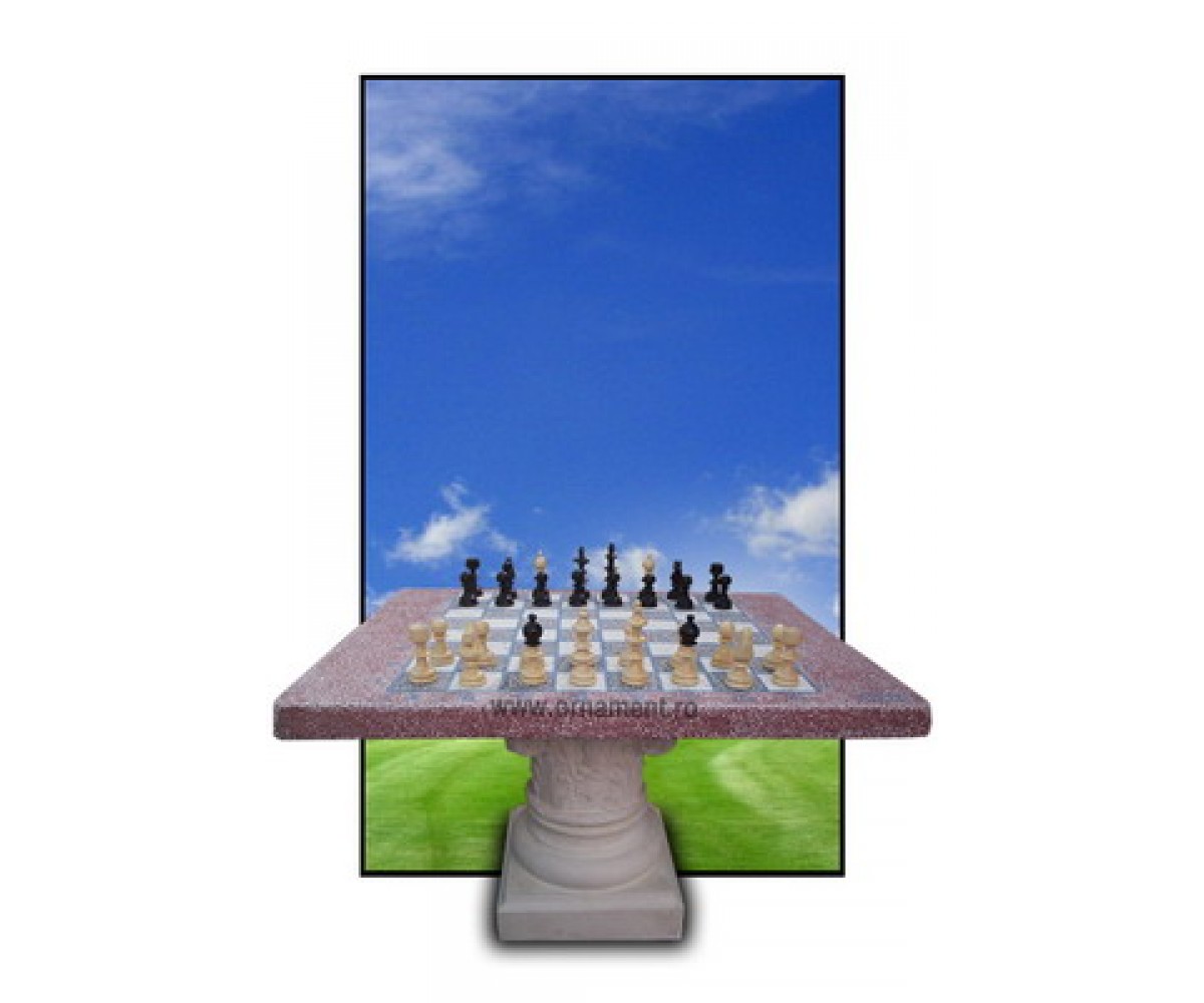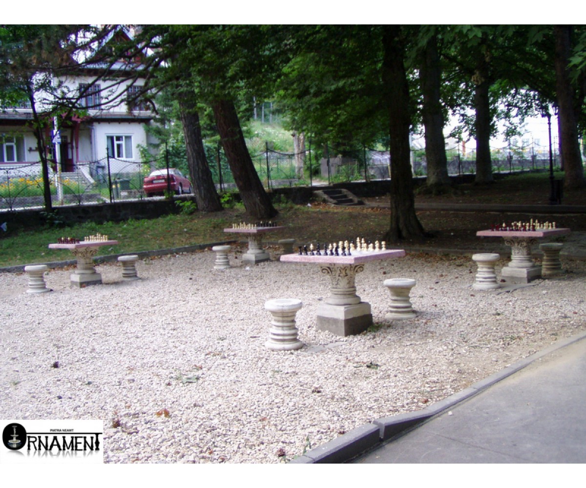 Masa de sah este compusa din : Blatul mesei, piciorul si doua scaune. Patratelele tablei de sah sunt din mozaic si sunt colorate din turnare avand o grosime de 5 cm aceastea nu se sterg chiar si dupa un timp indelungat. Literele, cifrele si liniile de demarcatie ale patratelelor sunt confectionate dintr-o rasina speciala care rezista la intemperii. Se pot monta atat in gradina cat si in parcuri datorita rezistentei sporite pe care o au.