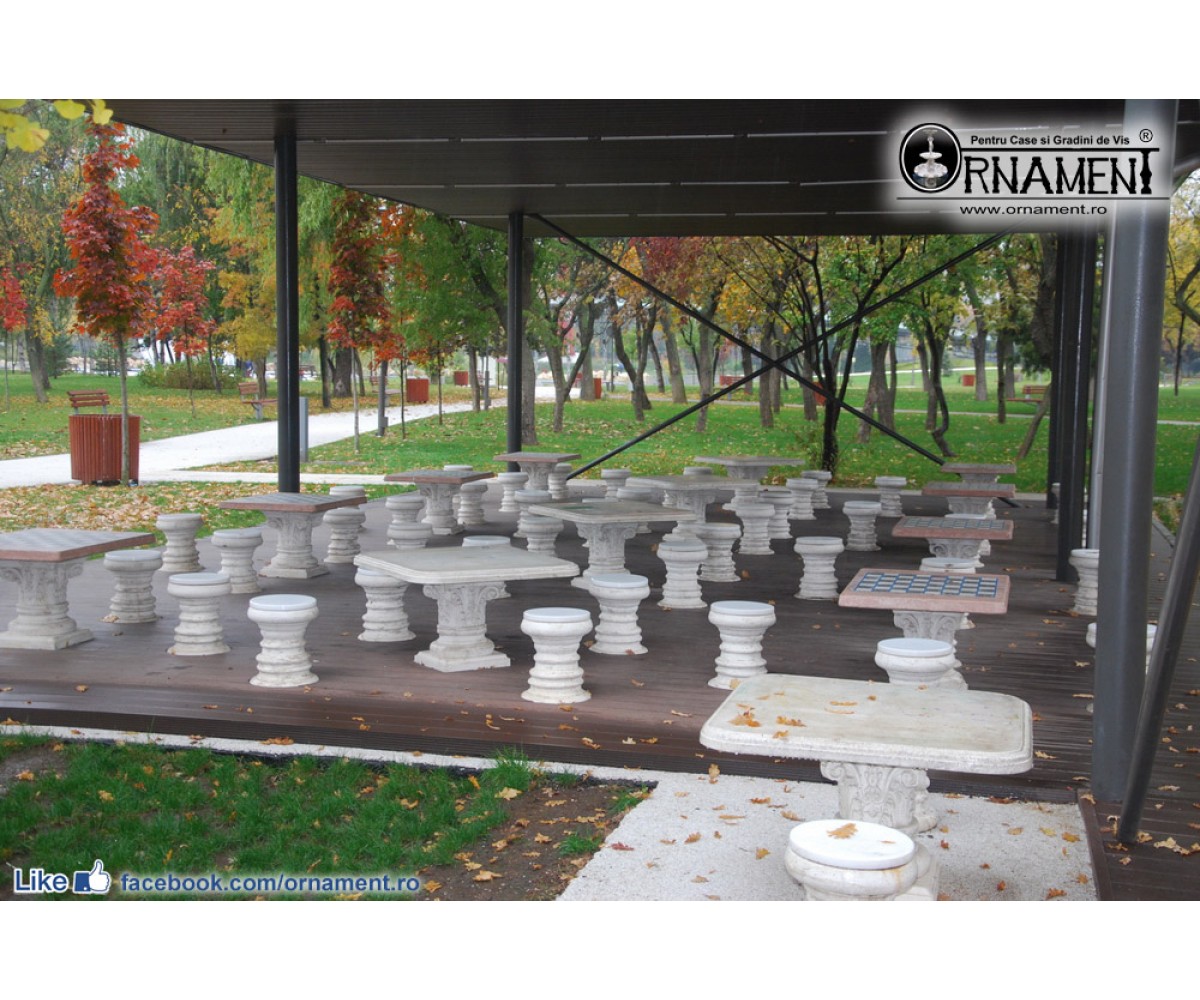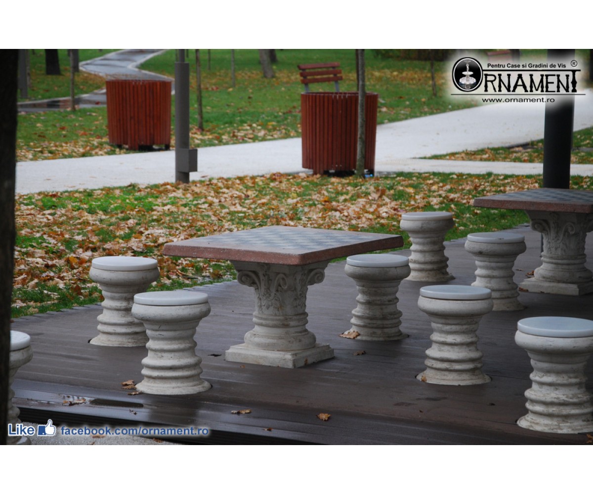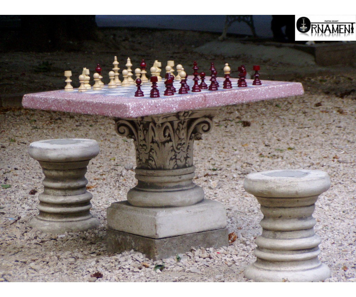 Masa de sah este compusa din : Blatul mesei, piciorul si doua scaune. Patratelele tablei de sah sunt din mozaic si sunt colorate din turnare avand o grosime de 5 cm aceastea nu se sterg chiar si dupa un timp indelungat. Literele, cifrele si liniile de demarcatie ale patratelelor sunt confectionate dintr-o rasina speciala care rezista la intemperii. Se pot monta atat in gradina cat si in parcuri datorita rezistentei sporite pe care o au.