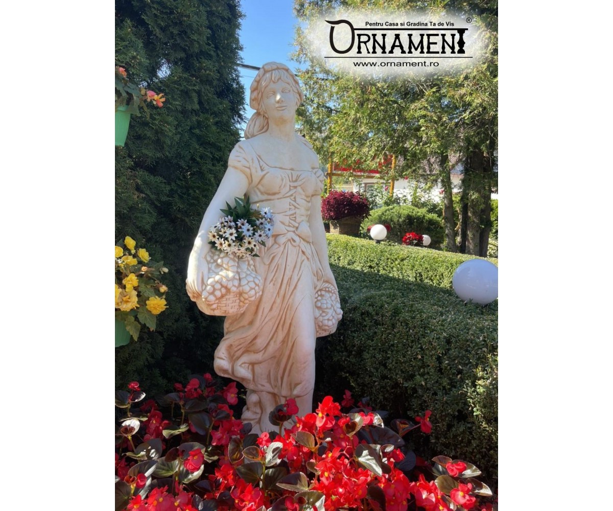 Aceasta statuie uimitoare infatiseaza o domnita imbracata intr-o rochie clasica, care tine in mainile ei doua cosuri pline cu struguri maturi. Fiecare detaliu este fin sculptat si finisat manual, adaugand un aspect autentic si o textura placuta statuii. Fiecare element al acestei opere de arta a fost realizat cu o atentie deosebita la detalii pentru a reprezenta cu fidelitate frumusetea vietii la tara.