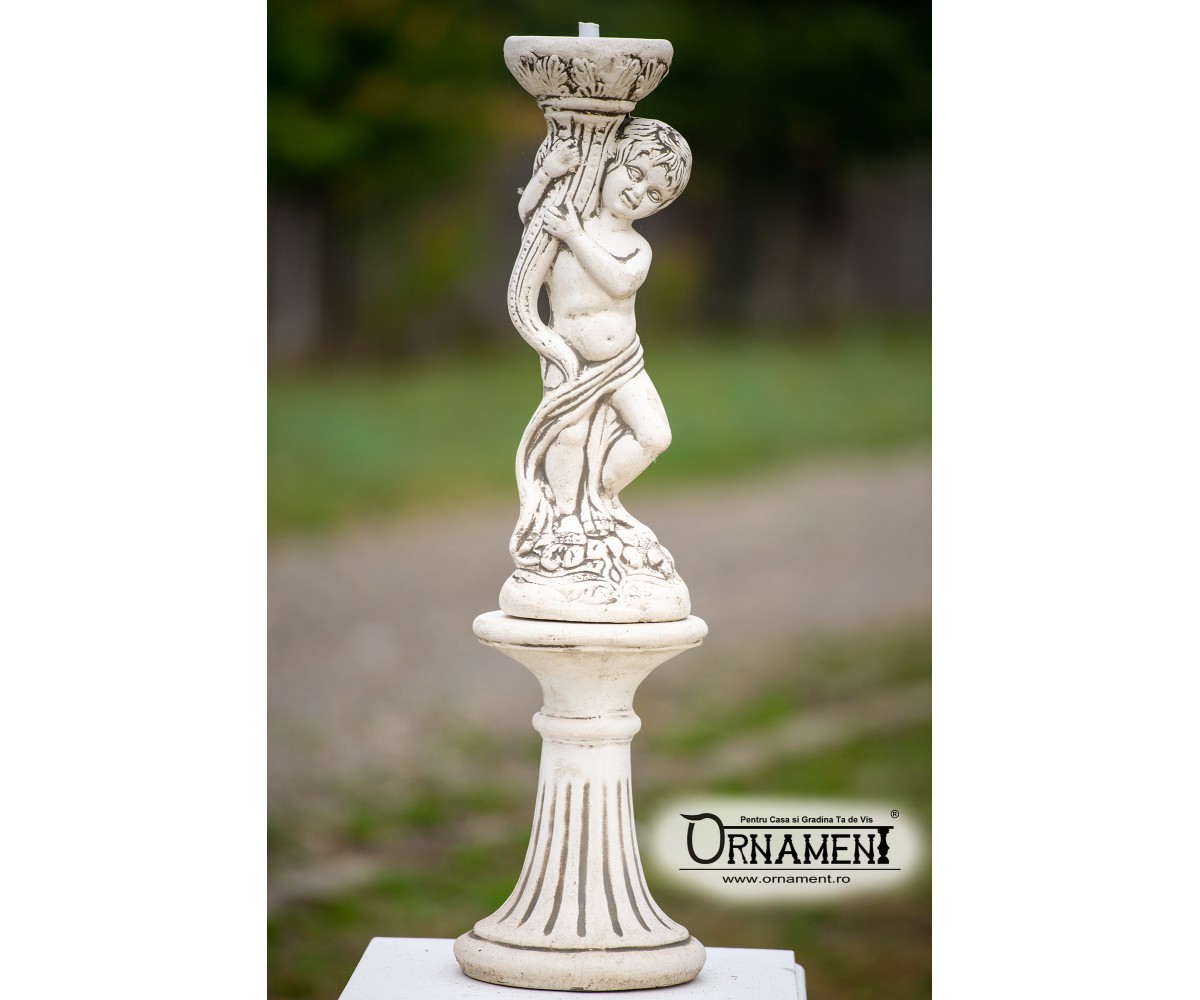O statueta eleganta si rafinata care interpreteaza un copil cu cornul abundentei in brate, asezata pe un soclu.